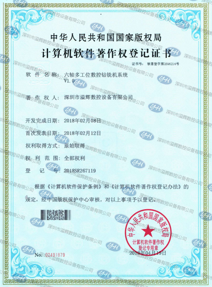 计算机软件著作权登记证书六轴多工位数控钻铣机系统V1.0